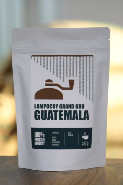Die Höhenlage von 1.200 Metern, das kühle und feuchte Mikroklima sowie die tiefgründig verwitterten Böden verleihen diesem Kaffee einen unglaublich vollen Körper mit feinen Säuren. Gran Cru hat eine leichte Fruchtnote und einen Hauch von Schokolade und Karamell. Diese hervorragenden Klimabedingungen machen den Guatemala Lampocoy zu einem Spitzenkaffee Guatemalas. Seit 2012 baut der deutsche Fernsehjournalist Dethlev Cordts zusammen mit seiner Frau das Kaffeeprojekt Lampocoy in Guatemala auf. Ziel des Projektes ist es, neben dem fairen und direkten Handel, die wirtschaftliche Besserstellung der sehr armen Kaffeebauern, den Schutz der sensiblen Umwelt, absolute Transparenz und höchste Qualität zu gewährleisten. Zusammen mit den Kleinbauern der Kooperative hat Cordts ein Projekt entwickelt, das den Bauern mehr Lebensqualität bietet und ihnen durch den Direktvertrieb nach Europa ein deutlich höheres Einkommen verschafft.